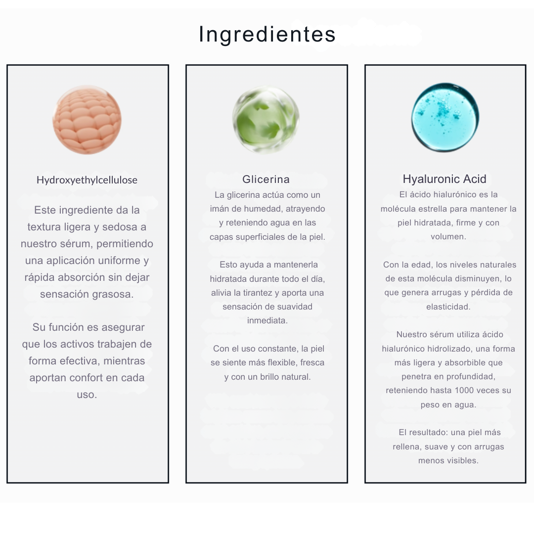 Ácido Hialurónico: retiene hasta 1000x su peso en agua → hidratación profunda.