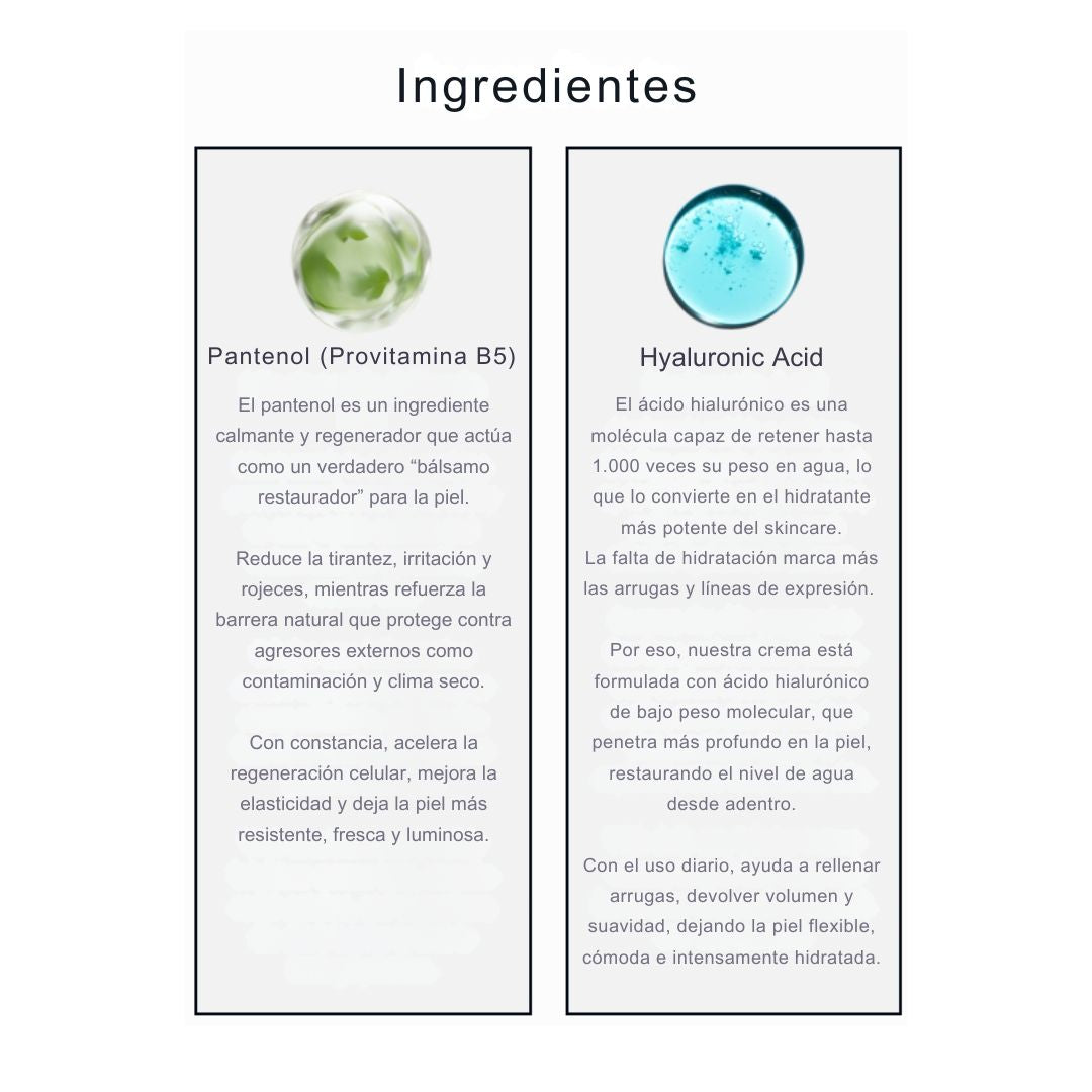Crema Facial con Ácido Hialurónico + Pantenol → sella hidratación, calma irritaciones y protege frente a clima y contaminación.